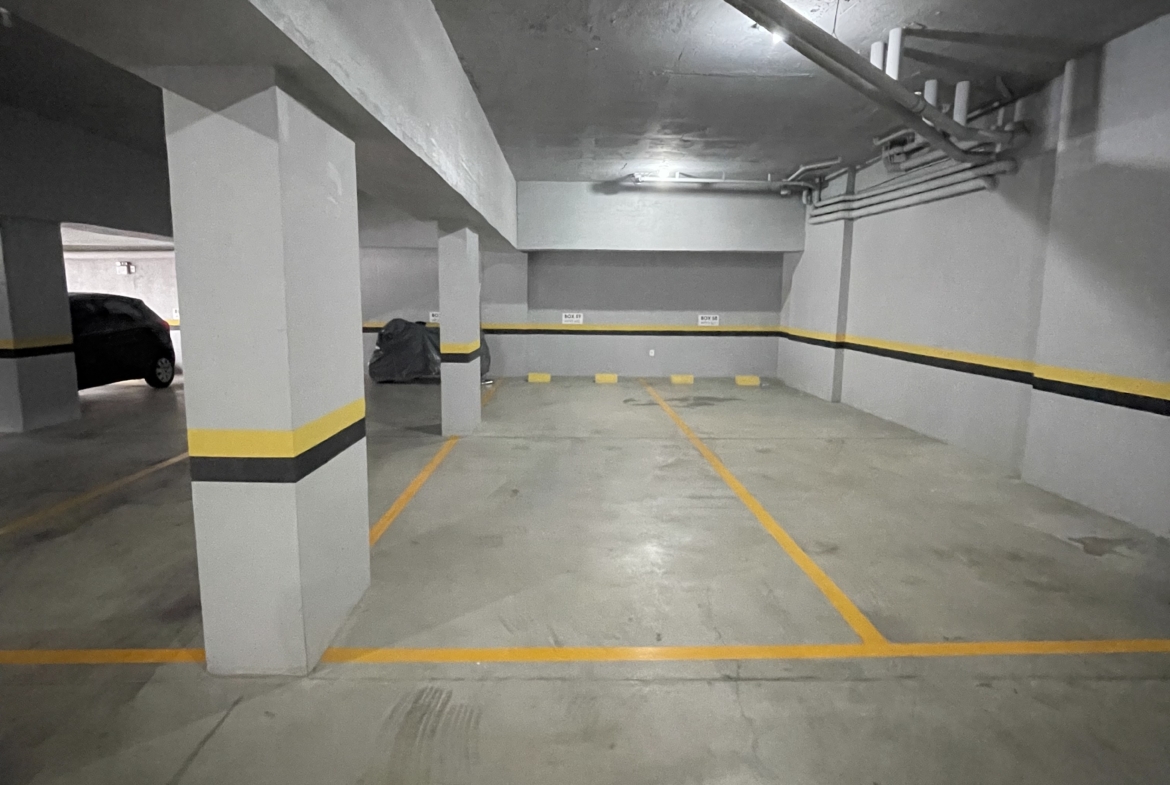 Imóvel com duas vagas de garagem, suíte e um quarto, varanda com churrasqueira e lavanderia privativa.