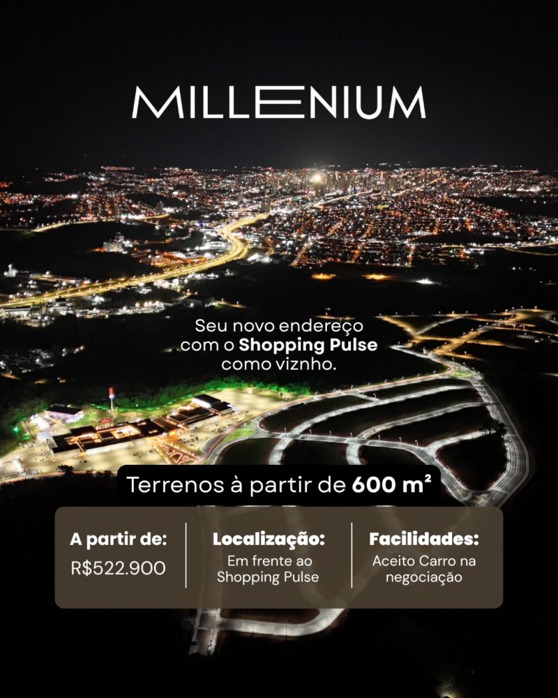 Loteamento planejado Millenium, localizado exatamente em frete ao Shopping Pulse Mall. Loteamento super planejado com inúmeros atrativos e diferenciais.